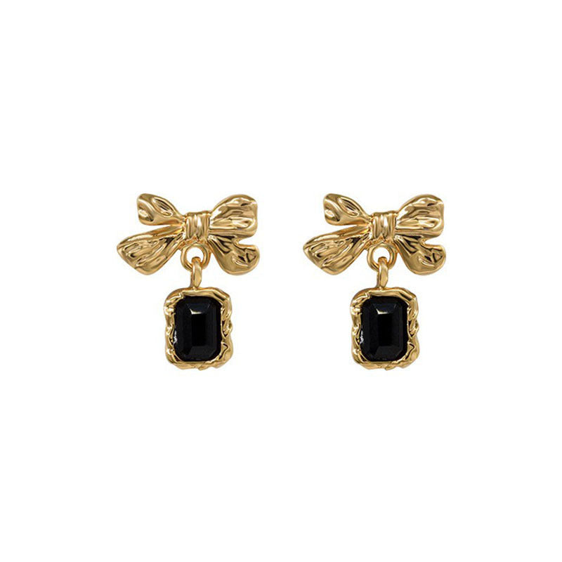 Vintage Gold Bow Earrings with Black Gemstone Drop-jlt11520
