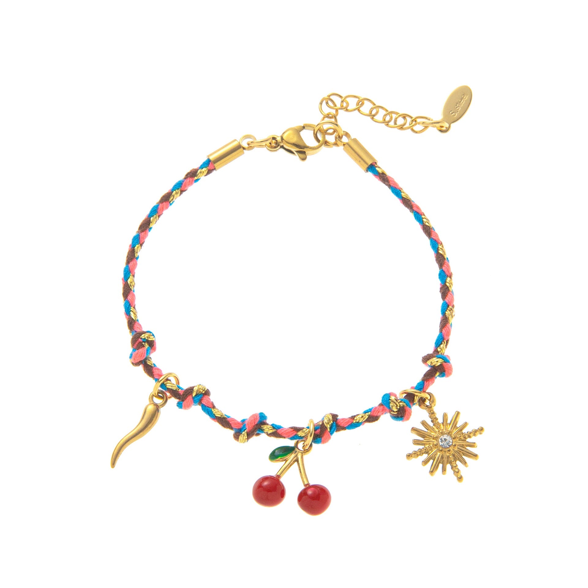This bracelet features a vibrant, multicolored braided cord that artfully combines shades of pink, blue, and gold, giving it a lively and youthful appearance. The bracelet is adorned with three distinct gold-toned charms: a slender chili pepper, a pair of glossy red cherries with green leaves, and a radiant sun-shaped charm encrusted with a sparkling central stone. The combination of playful motifs and elegant metallic elements creates a whimsical yet chic accessory. Secured with a lobster clasp and extender chain for adjustable fit, this piece is ideal for adding a pop of color and fun to any casual or festive outfit. Artificial bracelets latest designed for girls and women's with best price jewelry like women bracelets symbolizes wealth and status, good memories are like charms each is special you collect them.