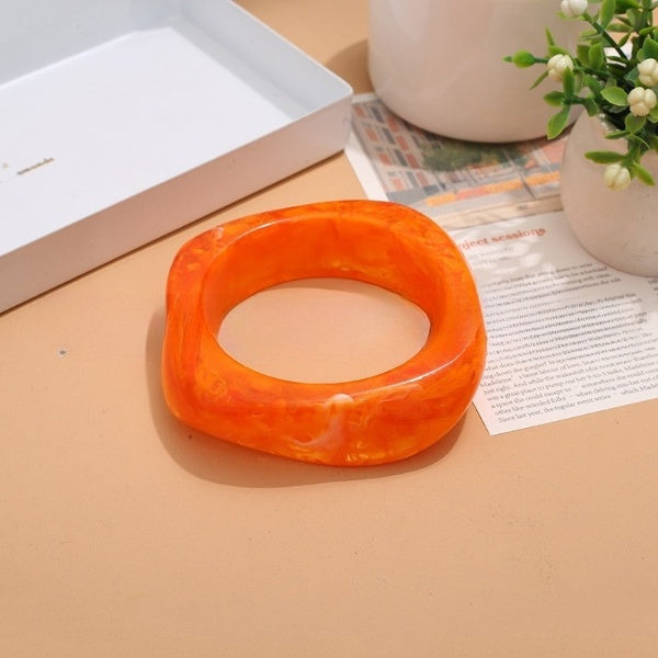 The image features a striking orange resin bangle with a unique square-rounded shape. The bangle has a translucent, marbled texture that gives it depth and character, blending vibrant shades of orange and subtle swirls of white. Its smooth, slightly asymmetrical design creates a modern and playful vibe. Artificial bracelets latest designed for girls and women's with best price jewelry like women bracelets symbolizes wealth and status, good memories are like charms each is special you collect them.