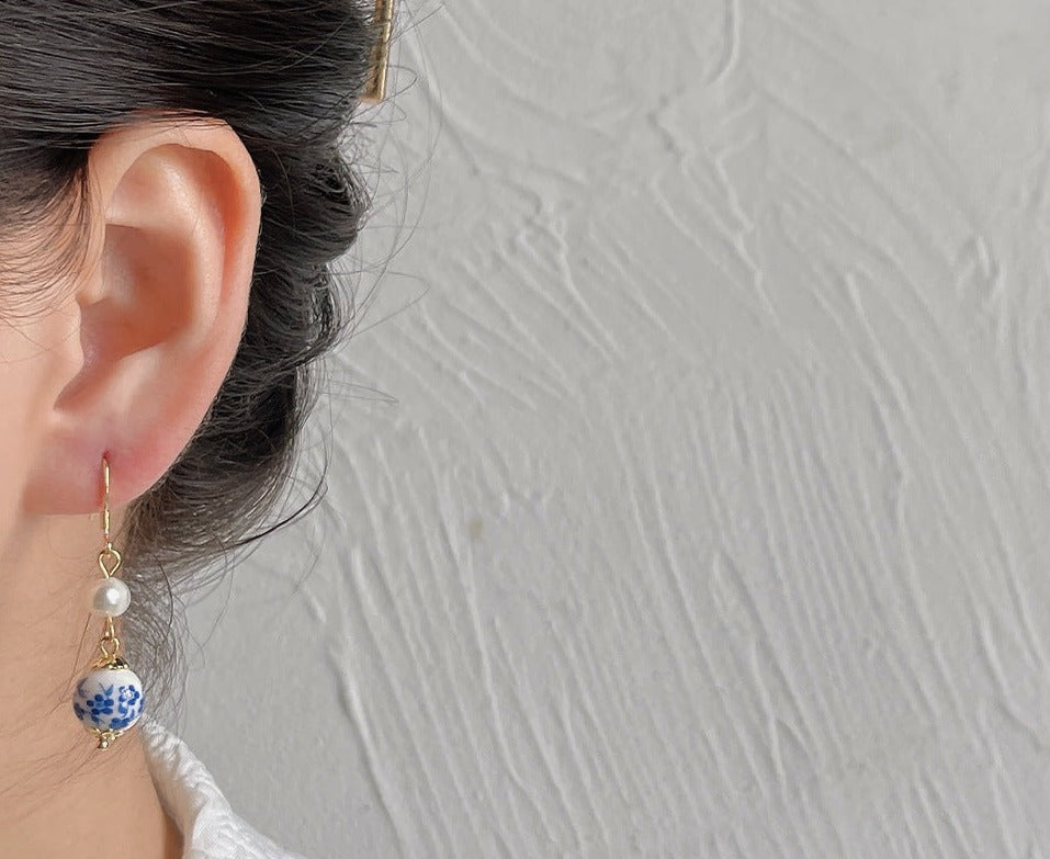 Add a touch of vintage charm to your look with these elegant porcelain and pearl drop earrings. Featuring delicate blue floral porcelain beads paired with lustrous pearls, these dangle earrings evoke a timeless, classic style perfect for any occasion. The intricate floral design on the porcelain bead adds an artistic touch, making these earrings a unique statement piece for those who appreciate sophistication and heritage-inspired jewelry. Lightweight and comfortable, these earrings bring an effortless elegance to both casual and formal attire, ideal for weddings, parties, or everyday wear.
