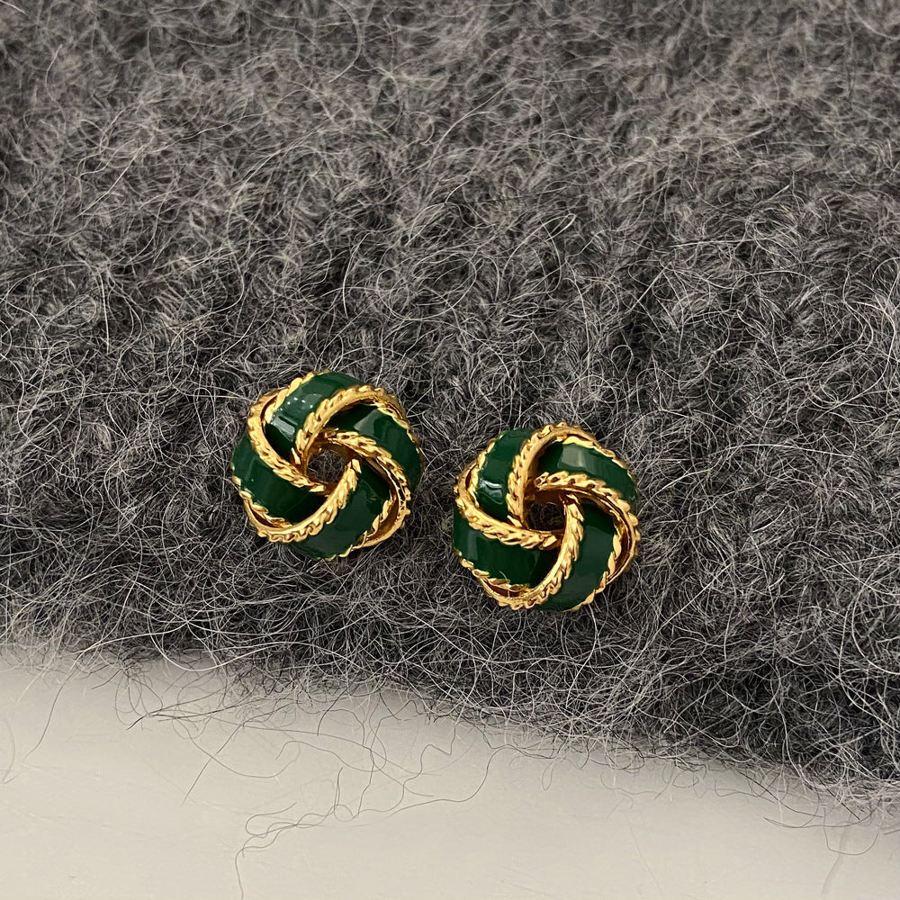 Vintage Trifari Enamel Knot Button Green Stud Earrings JLT12707